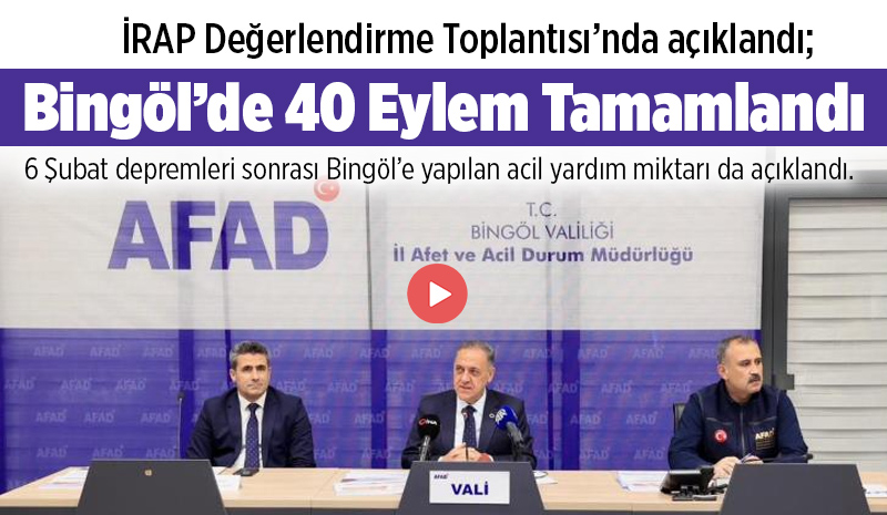 AFAD ev sahipliğinde düzenlenen İRAP Değerlendirme Toplantısı'nda, Bingöl'de afet risklerini azaltmaya yönelik yürütülen çalışmalar ele alındı; plan kapsamında belirlenen 99 eylemden 40'ının tamamlandığı açıklandı. 6 Şubat Depremleri Sonrası Bingöl'e yapılan acil yardım miktarı da açıklandı. |