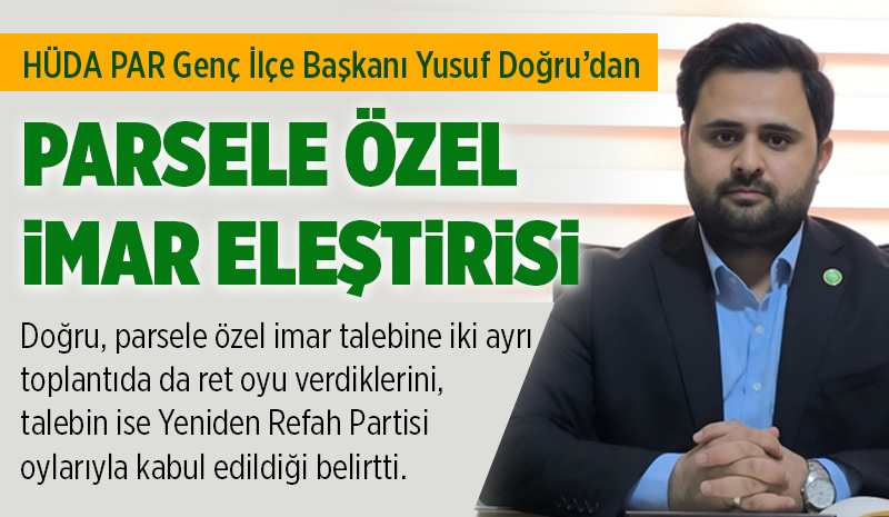 HÜDA PAR Genç İlçe Başkanı Yusuf Doğru, Genç Belediye Meclisi'nde gündeme gelen parsele özel imar talebine iki ayrı toplantıda da ret oyu verdiklerini açıkladı. Talebin ise diğer partilerin oylarıyla kabul edildiği belirtildi. |