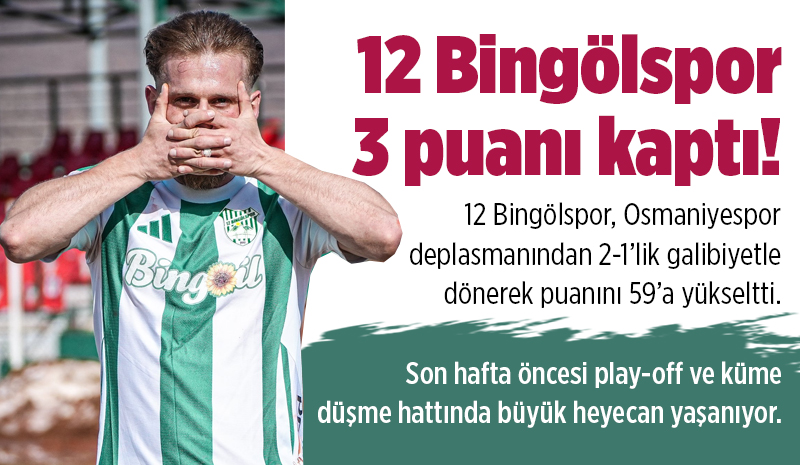 TFF 3. Lig 2. Grup'ta şampiyonluğu garantileyen 12 Bingölspor, Osmaniyespor deplasmanından 2-1'lik galibiyetle dönerek puanını 59'a yükseltti. Yeşil-beyazlı ekip, sezonun son haftasında sahasında oynayacağı Silifke Belediyespor karşılaşmasının ardından şampiyonluk kutlaması yapacak.