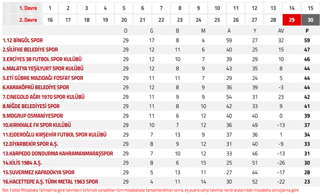 Öte yandan grupta son hafta öncesi play-off ve küme düşme hattında büyük heyecan yaşanıyor. 47 puanlı Silifke Belediyespor'un ardından 46 puanlı Erciyes 38 FK ile 44 puanlı üç takımın yer aldığı play-off hattında 41 puana kadar uzanan geniş bir yarış bulunuyor. Son hafta alınacak sonuçlara göre birden fazla takımın sıralaması değişebilecek.