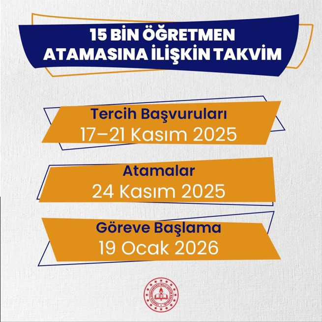 15 bin öğretmen atamasında takvim belli oldu15 bin sözleşmeli öğretmen istihdamı kapsamındaki tercih başvuruları, 17- 21 Kasım 2025 tarihleri arasında alınacak olup, atamalar 24 Kasım 2025 tarihinde yapılacak.![]() Öğretmen adaylarının beklediği haber geldi. 15 bin öğretmen atamasına ilişkin tercih ve atama kılavuzu yayımlandı. SÖZLÜ SINAV SÜRECİ TAMAMLANDI15 bin sözleşmeli öğretmen alımına ilişkin başvuru duyurusu ile branş bazında kontenjan dağılımları 18 Nisan 2025 tarihinde yayımlanmış, başvurular 21 Nisan-5 Mayıs 2025 tarihleri arasında alınmıştı. Sözleşmeli öğretmen istihdamına yönelik sözlü sınav süreci ise 23 Haziran-20 Ağustos 2025 tarihleri arasında tamamlandı. SINAV SONUÇLARI 29 AĞUSTOS'TA AÇIKLANDIAdayların sözlü sınav sonuçları, "Millî Eğitim Bakanlığı Sözleşmeli Öğretmen İstihdamına İlişkin Yönetmelik" hükümlerine göre KPSS puanının yüzde 50'si ile sözlü sınav puanının yüzde 50'si esas alınarak hesaplanan başarı puanlarına göre 29 Ağustos 2025 tarihinde ilan edildi. Adayların sözlü sınav sonuçlarına yönelik itirazları, 1-5 Eylül 2025 tarihleri arasında "eitiraz.meb.gov.tr" adresi üzerinden elektronik ortamda alındı. İtirazlar, sözlü sınav komisyonlarınca değerlendirilerek 3 Ekim 2025 tarihinde sonuçlandırıldı. ATAMA TAKVİMİ BELLİ OLDUSözlü sınava giren adaylardan başarılı olanların tercih ve atama işlemlerine ilişkin hazırlanan "2025 Yılı Sözleşmeli Öğretmenlik Tercih ve Atama Kılavuzu" ise bugün yayımlandı. Buna göre öğretmen adayları, eğitim kurumu tercih başvurularını 17-21 Kasım 2025 tarihleri arasında elektronik ortamda yapacak olup, atamalar 24 Kasım 2025 tarihinde gerçekleştirilecek. Ataması yapılan öğretmenler, güvenlik soruşturması ve arşiv araştırmasının tamamlanmasının ardından 19 Ocak 2026 tarihi itibarıyla görevlerine başlayacak. 2025 YILI SÖZLEŞMELİ ÖĞRETMENLİK TERCİH VE ATAMA KILAVUZU İÇİN TIKLAYINIZ