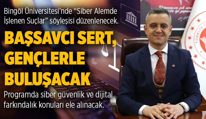 Bingöl Üniversitesi tarafından gençlerin dijital dünyadaki risklere karşı bilinçlendirilmesi amacıyla “Siber Alemde İşlenen Suçlar: Ne Kadar Farkındayız?” başlıklı söyleşi programı düzenlenecek. Bingöl Cumhuriyet Başsavcısı Abdullah Sert'in katılımıyla gerçekleştirilecek etkinlikte siber güvenlik ve dijital farkındalık konuları ele alınacak.