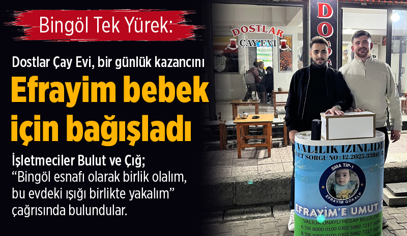 “Efrayim Hepimizin Evladı”Bir kahvehaneden yükselen bu iyilik hareketi, koca bir şehrin vicdanına dokundu. Dostlar Çay Evi'nin bu anlamlı adımı, yalnızca bir çocuğun değil, tüm Bingöl'ün yüreğine umut ekti. Kampanya yürütücüleri, desteklerin Bingöl Valiliği onaylı resmi hesaplar üzerinden yapılabildiğini belirterek her bağışın doğrudan tedavi masraflarına yönlendirildiğini hatırlatıyor. Efrayim'in yeniden gülümseyebilmesi, bir annenin yeniden umuda tutunabilmesi için Bingöl halkının ve esnafının desteği her zamankinden daha önemli. Unutmayalım: Birlik olursak, Efrayim yaşar.