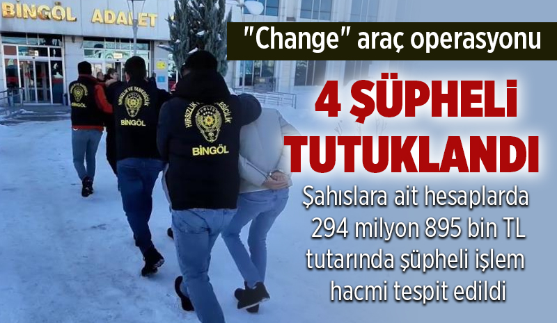 Bingöl'de ağır hasarlı araçlara ait şasi ve motor bilgilerini, çalınmış, aranan, hacizli ve gümrük kaçağı araçlara aktarılması suretiyle "change" işlemi yapan 4 şüpheli tutuklandı. 5 adet change araca el konulurken şüphelilere ait hesaplarda 294 milyon 895 bin TL tutarında şüpheli işlem hacmi tespit edildi.