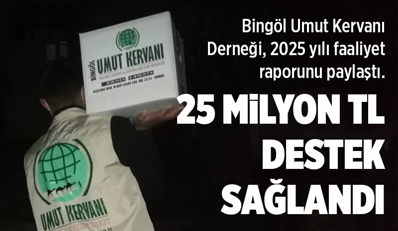 Bingöl Umut Kervanı'ndan 2025'te 25 Milyon TL'lik DestekDernek, yıl boyunca 5 bini aşkın aileye ayni ve nakdi yardım ulaştırdı; yurtdışı çalışmalarında ise Gazze ve Afrika'ya özel destek sundu.![]() Bingöl'de ihtiyaç sahipleri ile hayırseverler arasında köprü vazifesi gören Bingöl Umut Kervanı Derneği, 2025 yılı faaliyet raporunu kamuoyuyla paylaştı. Dernek, yıl boyunca kent içinde, yurt genelinde ve yurtdışında gerçekleştirdiği çalışmalarla toplam 25 milyon 90 bin 832 TL değerinde yardım ulaştırdı. Umut Kervanı Vakfı bünyesinde faaliyet gösteren Bingöl Umut Kervanı Derneği, 2025 yılı boyunca binlerce ihtiyaç sahibine kırmızı et, gıda, kırtasiye, giyim, ev eşyası ve nakit destek başta olmak üzere birçok kalemde yardım sağladı. “5 bin 343 aileye ulaşarak 10,4 milyon TL'lik yardım gerçekleştirdik”Dernek Başkanı Mehmet Refik Gönül, yürütülen faaliyetlere ilişkin yaptığı açıklamada, yıl boyunca 5 bin 343 aileye ayni ve nakdi yardım ulaştırdıklarını ifade etti. Gönül, 2025 yılı içerisinde yapılan destekleri kalem kalem şöyle açıkladı: