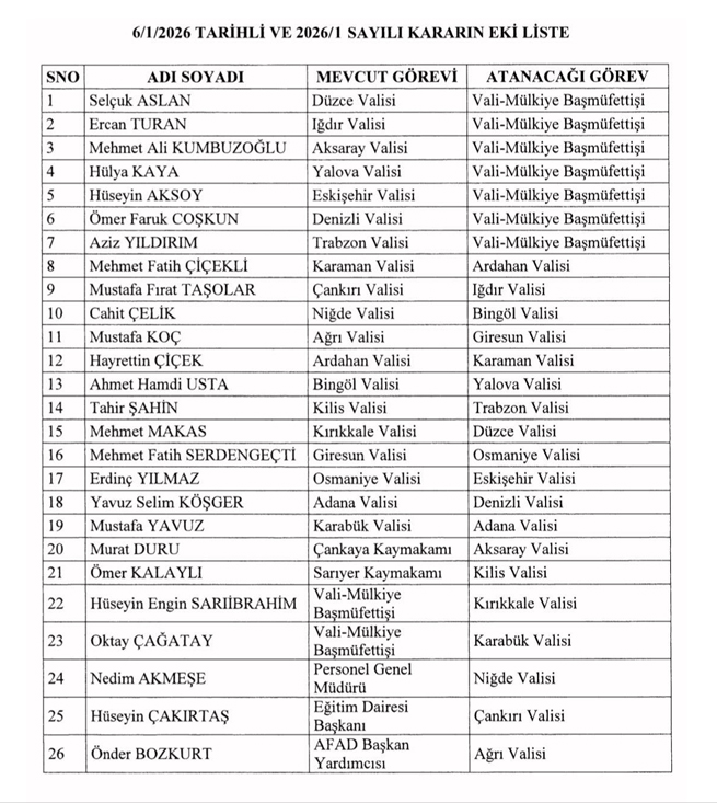 Resmî Gazete'de yayımlanan Valiler Kararnamesi ile 19 ile yeni vali atandı, 7 ilin valisi "vali-mülkiye başmüfettişliği" görevine getirildi. DEAŞ operasyonunun yapıldığı ve 3 polisin şehit olduğu Yalova'nın Valisi Hülya Kaya merkeze çekildi. Kaya yerine Bingöl Valisi Ahmet Hamdi Usta göreve getirildi. Bingöl Valiliği görevine ise Niğde Valisi Cahit Çelik atandı.