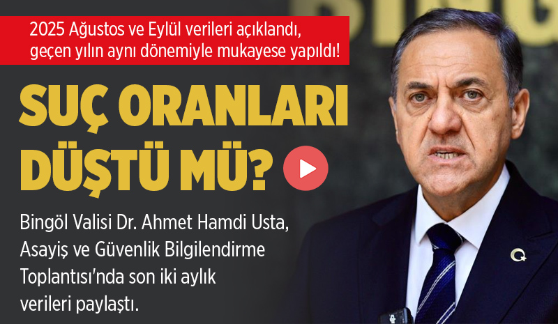 Bingöl Valisi Dr. Ahmet Hamdi Usta başkanlığında gerçekleştirilen Asayiş ve Güvenlik Bilgilendirme Toplantısı'nda, 2025 yılı Ağustos ve Eylül aylarına ait veriler kamuoyuyla paylaşıldı. Basın açıklamasına İl Jandarma Komutanı Tuğgeneral Sabri Küyük ve İl Emniyet Müdürü Beyti Kalaycı da katıldı.