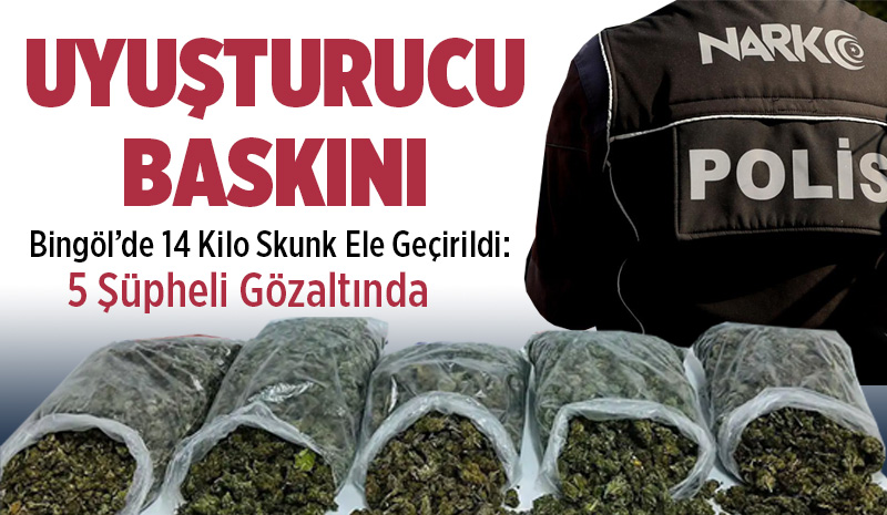 Bingöl'ün Genç ilçesinde şüpheli bir eve düzenlenen operasyonda 14 kilo 350 gram skunk ele geçirildi. Uyuşturucu maddeyle bağlantılı oldukları değerlendirilen 5 kişi gözaltına alındı.