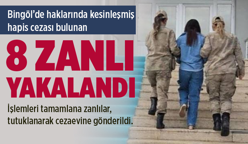 Bingöl İl Jandarma Komutanlığı, 30 Ocak-06 Şubat 2026 tarihleri arasında, aranan şahısların yakalanmasına yönelik çalışma yaptı. Yapılan çalışmada, çeşitli suçlardan kesinleşmiş hapis cezası bulunan 8 zanlı yakalandı. İşlemleri tamamlana zanlılar tutuklanarak cezaevine gönderildi.