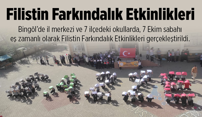 Bingöl'de il merkezi ve 7 ilçedeki okullarda, 7 Ekim sabahı eş zamanlı olarak Filistin Farkındalık Etkinlikleri gerçekleştirildi. Anaokulundan liseye kadar tüm kademelerde düzenlenen etkinliklerde öğrenciler, hem eğlenceli hem de farkındalık odaklı aktivitelerle Filistin konusunu işledi.