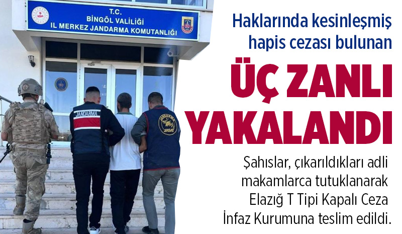 "Bingöl İl Jandarma Komutanlığı ekiplerimizce, Genç ve merkez ilçe mülki sınırları içerisinde 23 Eylül 2025 günü aranan şahısların yakalanmasına yönelik yapılan istihbarı ve fiziki takip sonucunda; ‘Uyuşturucu Madde Kullanma ve Ticaret Yapma, Hırsızlık, Dolandırıcılık ve Kişiyi Hürriyetinden Yoksun Kılma' suçlarından 9 yıl 4 ay 25 gün hapis cezası bulunan 1 şahıs, ‘Hükümlü veya Tutuklunun Kaçması ve Gece Vakti, Silahla Yol Kesmek Suretiyle ya da Konutta, İş Yerinde veya Bunların Eklentilerinde Yağma' suçlarından 9 yıl 2 ay hapis cezası bulunan 1 şahıs ve ‘Uyuşturucu veya Uyarıcı Madde Ticareti Yapma veya Sağlama' suçundan 8 yıl 4 ay hapis cezası bulunan 1 şahıs yakalanmış olup, toplamda yakalanan 3 şahıs çıkarıldığı adli makamlarca tutuklanarak Elazığ T Tipi Kapalı Ceza İnfaz Kurumuna teslim edilmiştir" denildi.