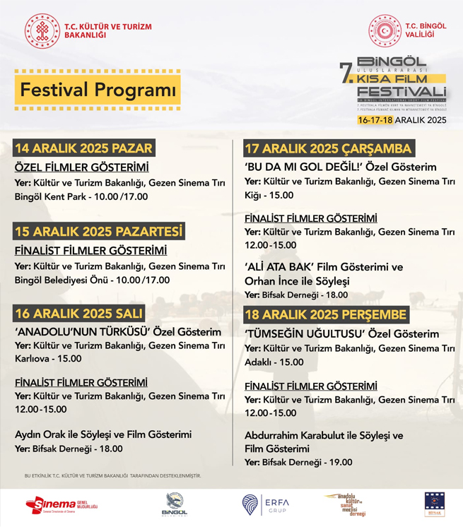 Bingöl'de Sinema Dolu Üç GünT.C. Kültür ve Turizm Bakanlığı'nın desteğiyle, Bingöl Valiliği ev sahipliğinde düzenlenen 7. Uluslararası Bingöl Kısa Film Festivali, açılış programıyla başladı. Festival kapsamında üç gün boyunca Bingöl merkez ve ilçelerinde film gösterimleri ve söyleşiler gerçekleştirilecek.![]() Bingöl'de sinema rüzgârı yeniden esiyor. 7. Uluslararası Bingöl Kısa Film Festivali, düzenlenen açılış programıyla başladı. T.C. Kültür ve Turizm Bakanlığı'nın katkılarıyla, Bingöl Valiliği ev sahipliğinde gerçekleştirilen festival, sinemaseverleri bir araya getiriyor. Festival kapsamında 16–17–18 Aralık 2025 tarihleri arasında Bingöl merkez başta olmak üzere Karlıova ve Adaklı ilçelerinde özel gösterimler, finalist film gösterimleri ve söyleşiler düzenlenecek. Etkinliklerin önemli bir bölümü, Kültür ve Turizm Bakanlığı Gezici Sinema Tırı aracılığıyla vatandaşlarla ücretsiz olarak buluşturulacak. Son yıllarda olduğu gibi bu yıl da festival seçkisinde, toplumsal hafıza, insan hikâyeleri ve sosyal meseleleri odağına alan kısa filmler öne çıkıyor. Özel gösterimler ve yönetmen söyleşileriyle sinemanın anlatıcı ve dönüştürücü yönüne vurgu yapılıyor. Özel Gösterimler İlçelere TaşınıyorFestival programı kapsamında;