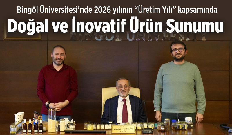 Bingöl Üniversitesi'nde 2026 yılının 'Üretim Yılı' ilan edilmesi kapsamında yürütülen çalışmalar çerçevesinde geliştirilen doğal ve yenilikçi ürünler, Rektör Prof. Dr. Erdal Çelik'e tanıtıldı. Çelik, bu tür yenilikçi ve yüksek katma değerli projelerin üniversitenin Ar-Ge kapasitesini güçlendirdiğini dile getirdi.