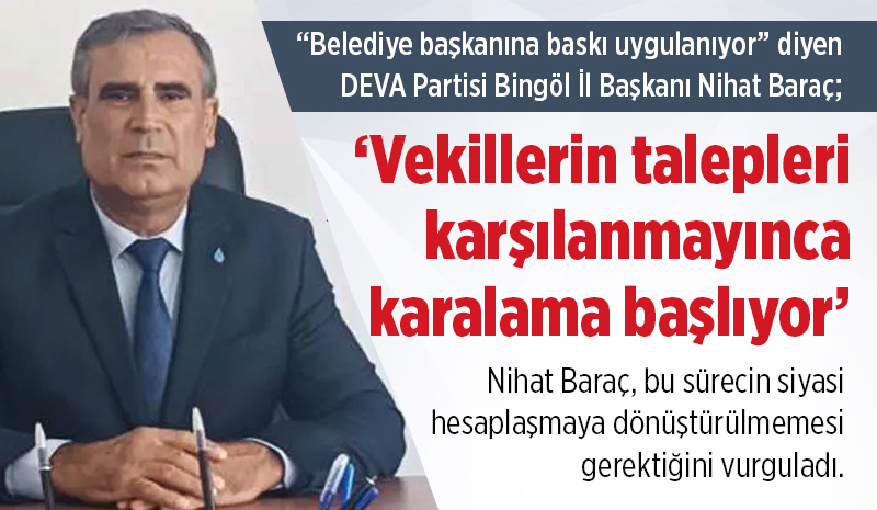 Baraç, 2019 yılında göreve gelen ve 2024 yerel seçimlerinde yeniden seçilen Bingöl Belediye Başkanı Erdal Arıkan'ın, kendi partisinin milletvekilleri tarafından baskı altına alınmaya çalışıldığını öne sürdü ve bu durumun belediye çalışmalarını sekteye uğrattığını savundu.