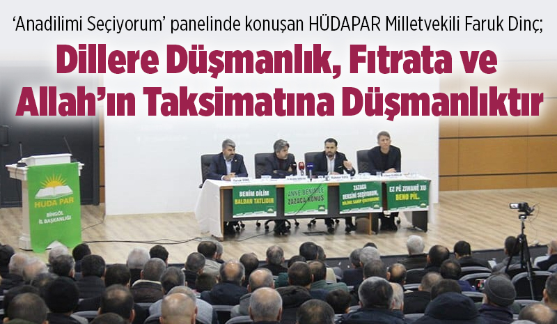 HÜDA PAR Eğitim İşleri Başkanlığı, okullardaki seçmeli ders sürecine dikkat çekmek ve anadil konusunda toplumsal farkındalık oluşturmak amacıyla Bingöl'de panel düzenledi. "Zıvanê Dadiya Xu Vicneno/A-Ana Dilimi Seçiyorum" başlıklı düzenlenen panelde dil çeşitliliğinin ilahi bir nimet ve zenginlik olduğu, anadilde eğitimin seçmeliden çıkarılarak kesintisiz bir şekilde tanınması gerektiğine vurgu yapıldı.