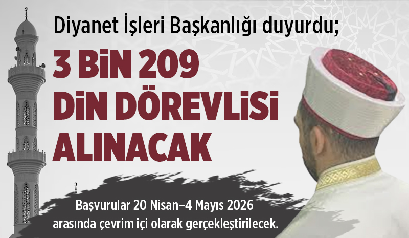 Diyanet İşleri Başkanlığı, KPSS puan sıralamasına göre sözlü sınavla 3 bin 209 aday din görevlisi alımı yapacağını duyurdu. Başvurular 20 Nisan–4 Mayıs 2026 tarihleri arasında çevrim içi olarak gerçekleştirilecek.
