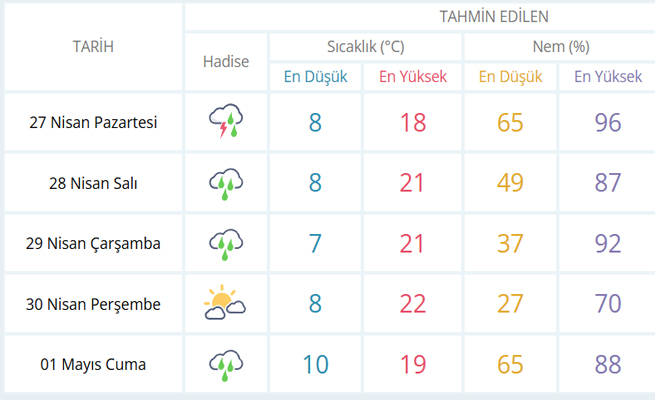 Yağışların Güneydoğu Anadolu'nun doğusu ile Bingöl, Elâzığ, Bitlis, Şırnak ve Hakkâri çevrelerinde yerel kuvvetli olması bekleniyor. Doğu Karadeniz'in iç kesimleri ile Doğu Anadolu'da yüksek kar örtüsüne sahip eğimli alanlarda çığ ve kar erimesi tehlikesine karşı uyarı yapıldı.