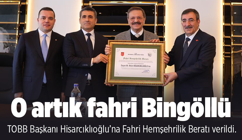 Bingöl Belediye Meclisi'nin oy birliğiyle aldığı karar doğrultusunda, TOBB Başkanı M. Rifat Hisarcıklıoğlu'na Fahri Hemşehrilik Payesi ve Beratı verilmesi kararlaştırıldı. Kararın ardından, Cumhurbaşkanı Yardımcısı Dr. Cevdet Yılmaz'ın teşrifleriyle düzenlenen törenle paye ve berat takdim edildi.