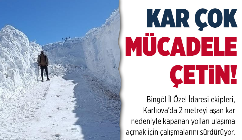 Bingöl'ün Karlıova ilçesinde etkili olan yoğun kar yağışı sonrası kırsal bölgelerde kar kalınlığı yer yer 2 metrenin üzerine çıktı. Karlıova ilçesine bağlı Hasanova Köyü Burmataş mezrasında da ulaşımın aksamaması ve vatandaşların mağduriyet yaşamaması için ekipler iş makineleriyle aralıksız mesai yapıyor.