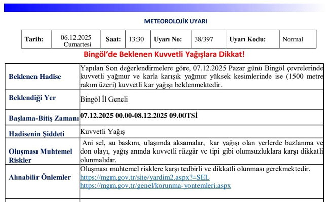Meteoroloji 13. Bölge Müdürlüğü'nden yapılan açıklamada, "Yapılan son değerlendirmelere göre, 07 Aralık 2025 pazar günü gece yarısından itibaren Bingöl ve çevresinde kuvvetli yağmur ile karla karışık yağmur, 1,500 rakımı aşan yüksek yerlerde ise kuvvetli kar yağışı beklenmektedir. Ani sel, su baskını, ulaşımda aksamalar, kar yağışı olan yerlerde buzlanma ve don olayı, yağış anında kuvvetli rüzgâr ve tipi gibi olumsuzluklara karşı dikkatli olunmalıdır” denildi.