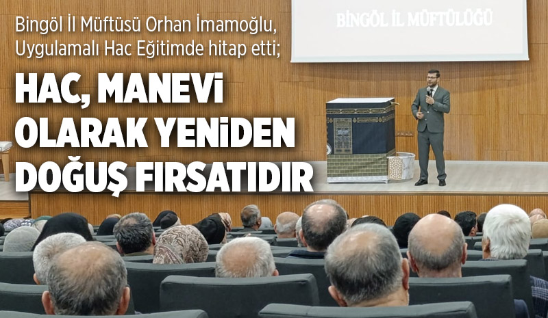"ÇOKÇA DUA EDİN, HELALLİK ALIN”Müftü İmamoğlu konuşmasında, maneviyatın yaşamdaki önemine değinerek katılımcılara çeşitli tavsiyelerde bulundu. Kutsal topraklara yolculuk öncesinde duaların yoğun olarak yapılmasının ve çevredeki insanlardan helallik alınmasının ne denli değerli olduğunu anlatan İmamoğlu, ayrıca, varsa kalplerdeki dargınlıklardan bir an önce kurtulmanın da ruhsal arınma adına önemli bir adım olduğunu dile getirdi. “HAC, MANEVİ OLARAK YENİDEN DOĞUŞ FIRSATIDIR”Müftü İmamoğlu, hac ibadetinin bir arınma ve adeta manevi olarak yeniden doğuş fırsatı sunduğunu vurgulayarak, Peygamber Efendimiz'in (s.a.v) buyurduğu sözlere dikkat çekti: “Kim bu kutsal evi yani Kâbe'yi ziyaret ederken şehvi arzulardan uzak durur ve kötülük yapmaktan kaçınırsa, annesinin onu dünyaya getirdiği günkü gibi günahsız bir hale döner” diyerek manevi anlamda bu eşsiz fırsatın en iyi şekilde değerlendirilmesinin önemini dile getirdi. Düzenlenen bu tür seminerlerin hac yolculuğuna hazırlık sürecinde önemli bir adım olduğunu dile getiren İmamoğlu: “Hacı adaylarımızın bilinçli ve huzurlu bir ibadet gerçekleştirmeleri için düzenlediğimiz bu eğitim, manevi ve pratik bilgilerin yanı sıra toplumsal birlik ve beraberliğimizi de pekiştirmektedir” ifadelerini kullandı. Bingöl İl Müftüsü Orhan İmamoğlu'nun hitabının ardından seminer, uygulamalı eğitimle, hac ibadetinin rükünleri detaylı şekilde anlatıldı. Katılımcılara Kâbe maketi etrafında tavaf uygulaması, şeytan taşlama, vakfe, ihram ve diğer temel ibadetler görsel materyallerle anlatılarak uygulamalı olarak gösterildi. Seminer, katılımcıların manevi hazırlık ve pratik bilgi kazandıkları verimli bir etkinlik olarak sona erdi.