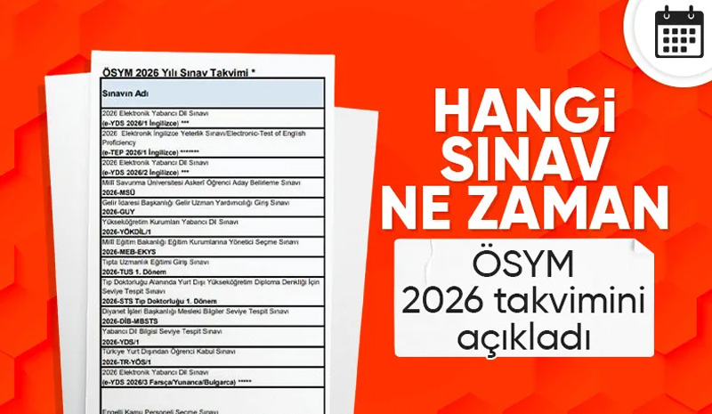 ÖSYM, 2026 yılı sınav takvimini duyurduHangi sınav ne zaman? ÖSYM Başkanı Prof. Dr. Bayram Ali Ersoy sosyal medya hesabından yaptığı açıklamada, 2026 yılı sınav takvimini duyurdu.![]() ÖSYM, 2026 yılı sınav takvimini duyurdu. Binlerce adayın ter dökeceği sınavların tarihleri de yapılan duyuru ile netleşmiş oldu. Adaylar ÖSYM'nin sınav takvimine, kurumsal web sayfası üzerinden ulaşabilecek. Ayrıca açıklana takvime göre, Yükseköğretim Kurumları Sınavı (YKS) 20-21 Haziran 2026 tarihinde yapılacak. ÖSYM BAŞKANI AÇIKLAMA YAPTIÖSYM Başkanı Prof. Dr. Bayram Ali Ersoy, yaptığı açıklamada