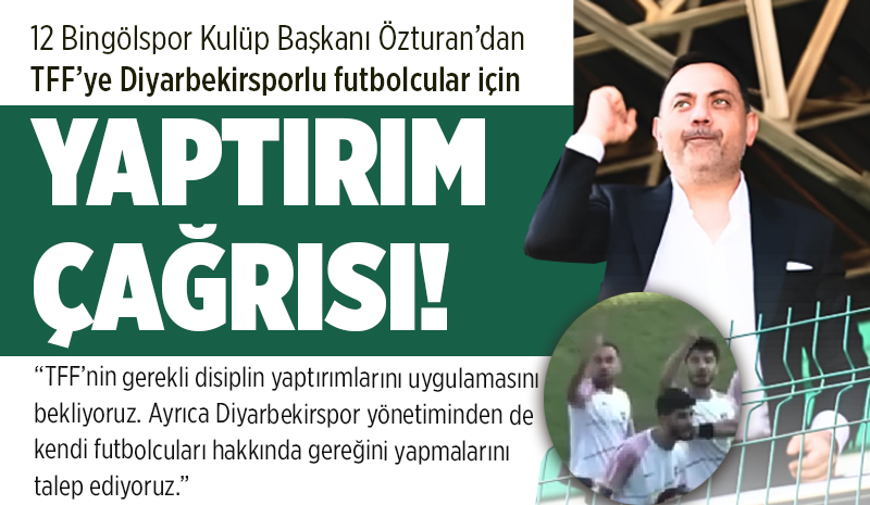 12 Bingölspor Kulüp Başkanı Mehmet Engin Özturan, Diyarbekirspor futbolcularının kendisine yönelik küfür ve tehditte bulunduğunu belirterek, Türkiye Futbol Federasyonu'na gerekli yaptırımların uygulanması çağrısında bulundu.