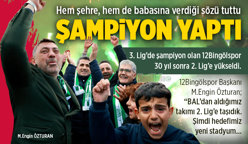 Verdiği sözü tuttu! Özturan: 'Bu daha başlangıç, sırada stat var'12 Bingölspor Başkanı Mehmet Engin Özturan, 2. Lig'e yükselmenin ardından hem memlekete hem de babasına verdiği sözü tuttuğunu söyledi. Şampiyonluk sevincinin ortasında konuşan Özturan, 'BAL'dan aldığımız takımı 2. Lig'e taşıdık. Şimdi hedefimiz stat… Bu şehir dışarıda kalmayacak' dedi.![]() TFF 3. Lig 2. Grup 28. haftada sahasında Hacettepe A.Ş. Türk Metal 1963 Spor'u ağırlayan 12Bingölspor, sahadan 4-0'lık net bir galibiyetle ayrılarak bitime iki hafta kala şampiyonluğunu ilan etti. Bingöl Şehir Stadyumu'nda tribünleri dolduran taraftarlar, tarihi anlara tanıklık ederken son düdükle birlikte saha ve tribünler tek yürek oldu. Yıllardır beklenen başarıyla birlikte yeşil-beyazlı futbolcular ve taraftarlar sahada kenetlenirken, Bingöl'de adeta bayram havası yaşandı. Tribünlerden sahaya inen taraftarlar, futbolcularla birlikte şampiyonluğu kutladı. Uzun süredir özlenen 2. Lig bileti, coşkulu görüntüler eşliğinde alındı. “Babama söz vermiştim…”Şampiyonluğun ardından konuşan 12 Bingölspor Başkanı Mehmet Engin Özturan, açıklamasında duygusal ifadeler kullandı. Özturan, memlekete ve babasına verdiği sözü yerine getirmenin gururunu yaşadığını söyledi. “Memleketimize bir söz vermiştik, babama bir söz vermiştim. BAL Ligi'nden aldığımız takımı 2. Lig'e taşıdık. Bu başarı Bingöl'ündür. Yönetimimiz, teknik heyetimiz, futbolcularımız ve taraftarımızla birlikte başardık. İnşallah bu takım daha iyi yerlere gelecek” dedi. “Bu şehir dışarıda kalmayacak”Şampiyonluk sonrası yeni hedefi de açıklayan Özturan, stadyum konusuna dikkat çekerek taraftara söz verdi. “Önceliğimiz stat projemizin bitmesi gerekiyor. İnsanlar dışarıda kalmasın. Bu şehir bu başarıyı daha büyük bir statta yaşamalı. Bingöl bunu hak ediyor. Bu şampiyonlukla birlikte stat projesinin hızlanacağına inanıyorum” ifadelerini kullandı. Protokolden tebrik mesajlarıBingöl Valisi Cahit Çelik de tarihi başarı sonrası teknik heyet ve futbolcuları tebrik ederek, “Öncelikle tüm teknik heyetimizi ve futbolcularımızı canı gönülden tebrik ediyorum. Kulüp başkanımıza ve yönetimimize teşekkür ediyorum” dedi. Bingöl Belediye Başkanı Erdal Arıkan ise uzun yıllar sonra gelen başarının önemine dikkat çekerek, “2. Lig'deyiz. Çok uzun bir aradan sonra yeniden 2. Lig'e çıktık. Emeği geçen herkese çok teşekkür ediyorum” ifadelerini kullandı. Hedef şampiyonluktu, başarı geldiTakımın tecrübeli isimlerinden Halil İbrahim Sevinç ise sezon başından bu yana tek hedeflerinin şampiyonluk olduğunu belirterek, “Sezon başında tek hedefimiz şampiyonluktu. Biraz gecikti ama sonuç güzel oldu. Çok mutluyuz” diye konuştu. 30 yıllık özlemi bitiren 12 Bingölspor, 2. Lig'e yükselmenin gururunu yaşarken, Bingöl futbolu da yeni bir dönemin kapısını araladı. Şimdi şehirde tek gündem; şampiyonluk kutlamaları ve 2. Lig'de yazılacak yeni hikâye…