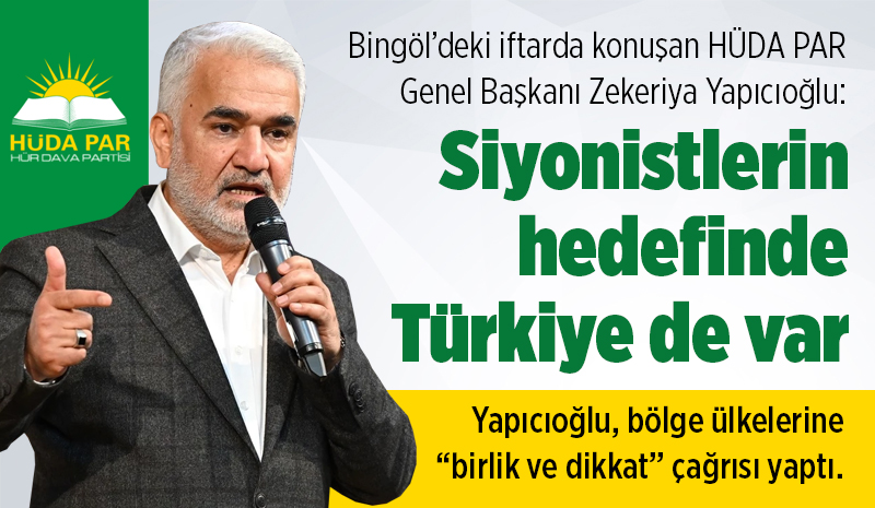 Bingöl'de HAKSİAD'ın iftar programında konuşan HÜDA PAR Genel Başkanı Zekeriya Yapıcıoğlu, Siyonist saldırganlığın Filistin'le sınırlı kalmayacağını belirterek, 'Vadedilmiş topraklar hedefinde Türkiye de var' dedi. Yapıcıoğlu, bölge ülkelerine 'birlik ve dikkat' çağrısı yaptı.