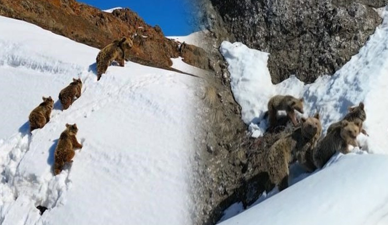 Bingöl'de kış uykusundan çıkan bir bozayı ve üç yavrusu, karla kaplı arazide dron ile görüntülendi. Nadir anlar doğa gezgini Doğuş Başak tarafından kaydedildi.