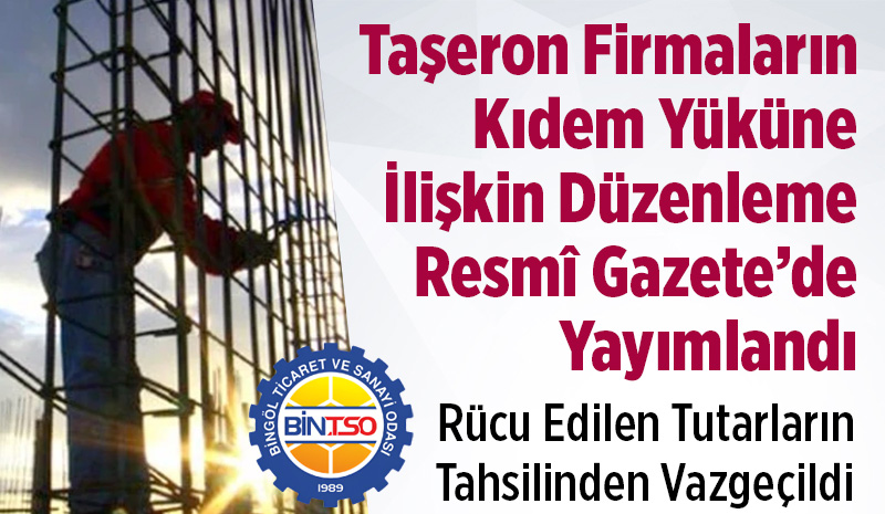 Bingöl Ticaret ve Sanayi Odası (BİNTSO), 696 sayılı KHK kapsamında kadroya alınan işçiler nedeniyle alt işveren firmalara yüklenen kıdem tazminatı rücu işlemlerinin kaldırılmasına yönelik yasal düzenlemenin Resmî Gazete'de yayımlanarak yürürlüğe girdiğini açıkladı. |